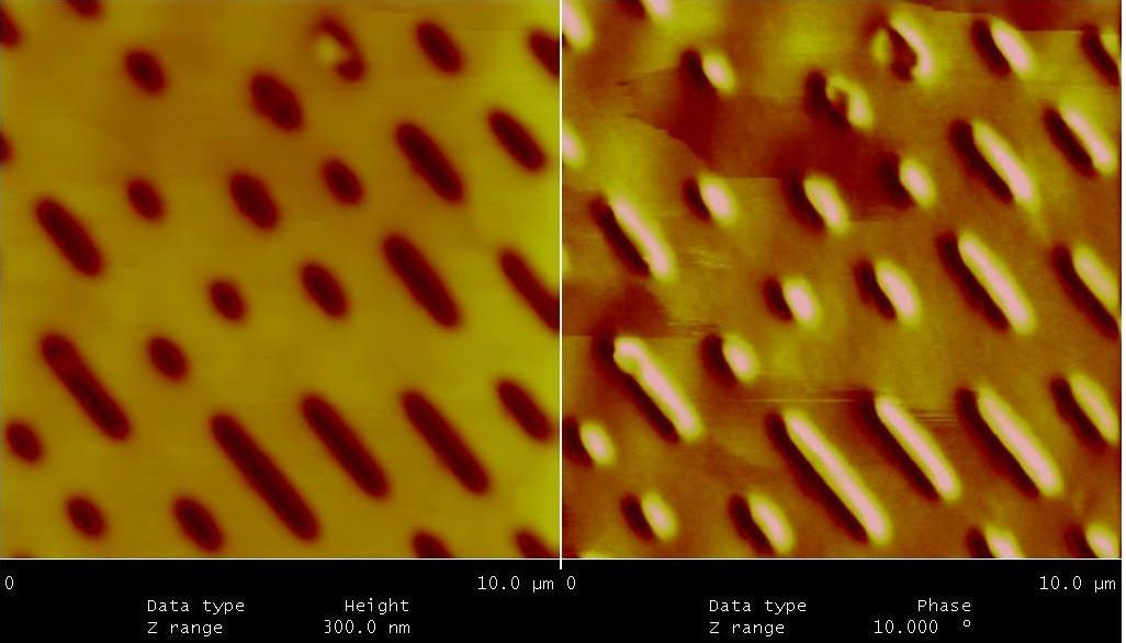 分析磁記錄材料(圖6-1),磁性薄膜的表面磁區及磁壁分布,如鈷薄膜上的非對稱 Bloch 磁壁及 cross-tie 磁壁有共存現象(圖6-2)與結構缺陷所產生的磁性結構(圖6-3)。